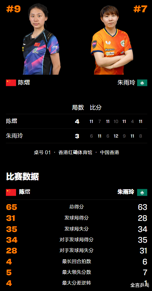 比赛开始后,陈熠在首局打得比较有耐心,虽然也有数次出现失误,但依旧坚持以高质量、加转弧圈球压制朱雨玲,很快便取得10-5领先的优势,随后朱雨玲通过节奏变化追回1分,但最终还是被国乒小将以11-6拔得头筹。